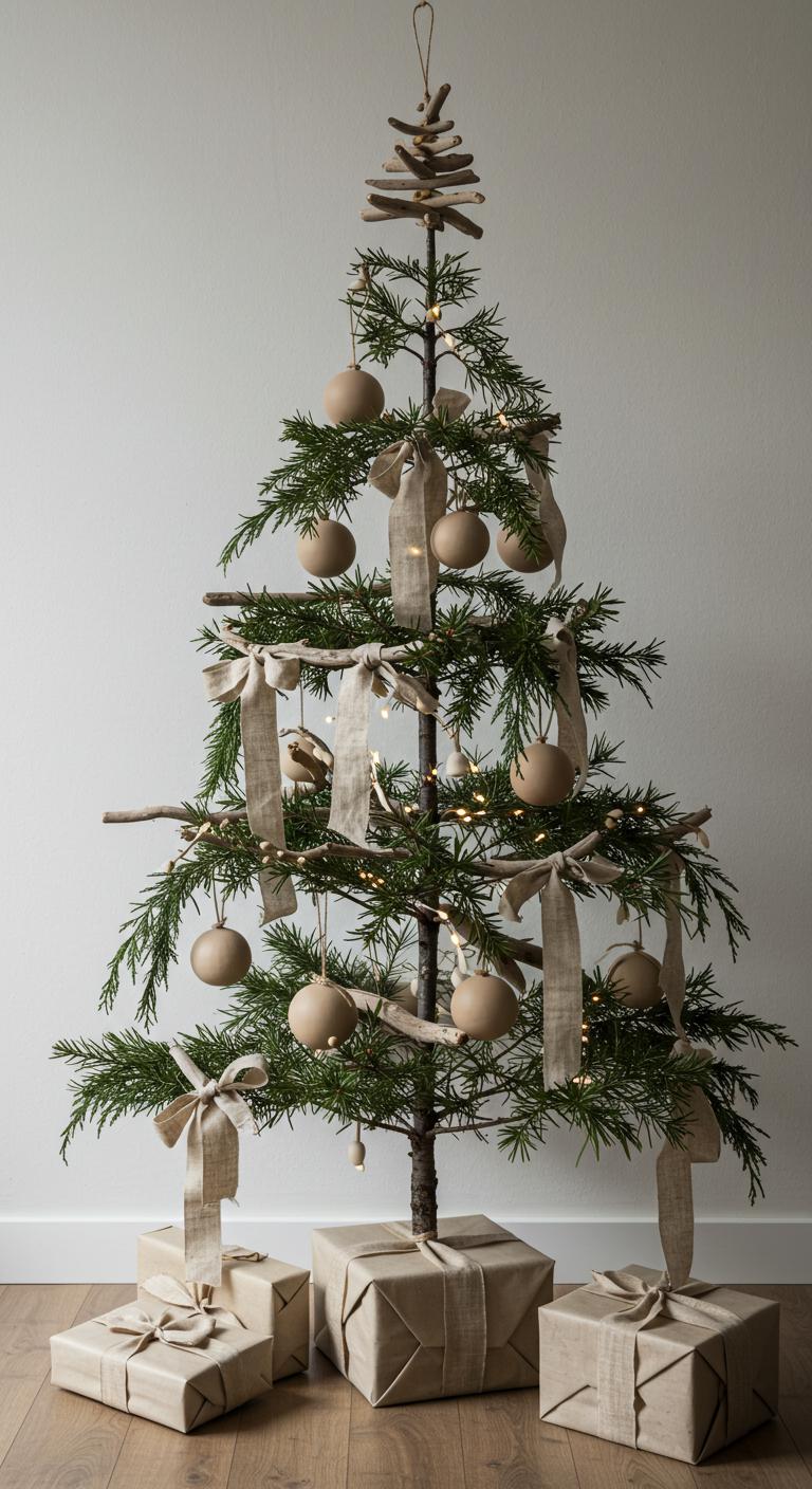Natural textures bring warmth without fuss: choose driftwood, bleached branches, woven reeds, or unfinished pine for a tree that feels calm and curated.