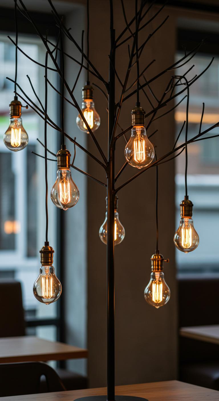 If you liked the grounded feel of a wood-and-green tree, try swapping foliage for light: a bare-bulb Edison tree uses exposed filaments and warm amber glow to create sculptural warmth without clutter.