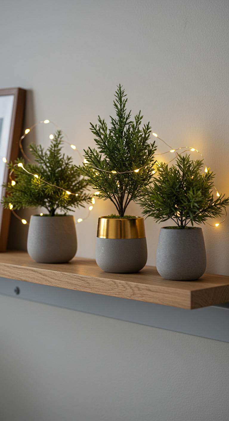 Place three mini potted evergreens along a narrow shelf to create a scaled-down winter landscape that reads modern and intentional. You’ll balance potted evergreen placement by varying pot heights and negative space, keeping decor minimal. Use muted pots, a single metallic accent, and soft LED fairy lights. This shelf styling feels liberated, editable, and effortlessly seasonal without clutter or fuss.
