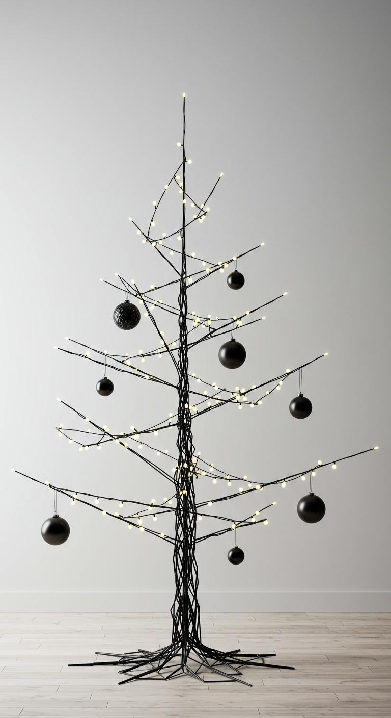 You’ll embrace a clean geometric design that reads modern and airy. Hang a few minimalist baubles or string lights along the wire decor to define form without clutter.