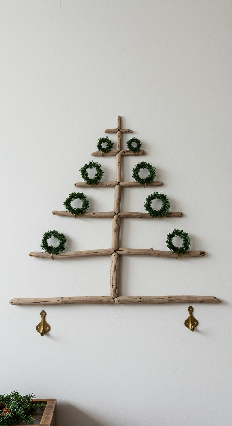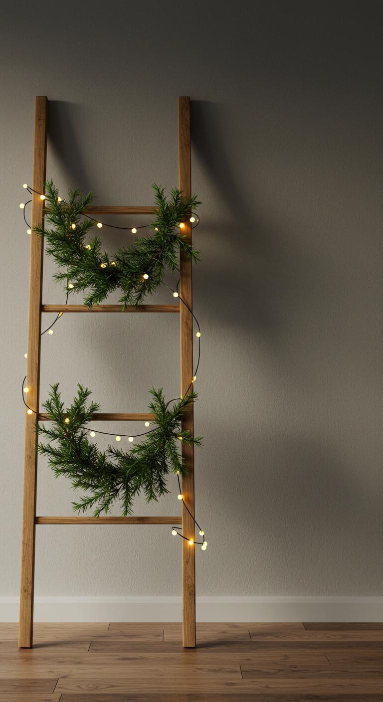 If you want a sleek, space-saving tree that still feels organic, lean a simple wooden ladder against the wall and weave a few sprigs of evergreen through its rungs.