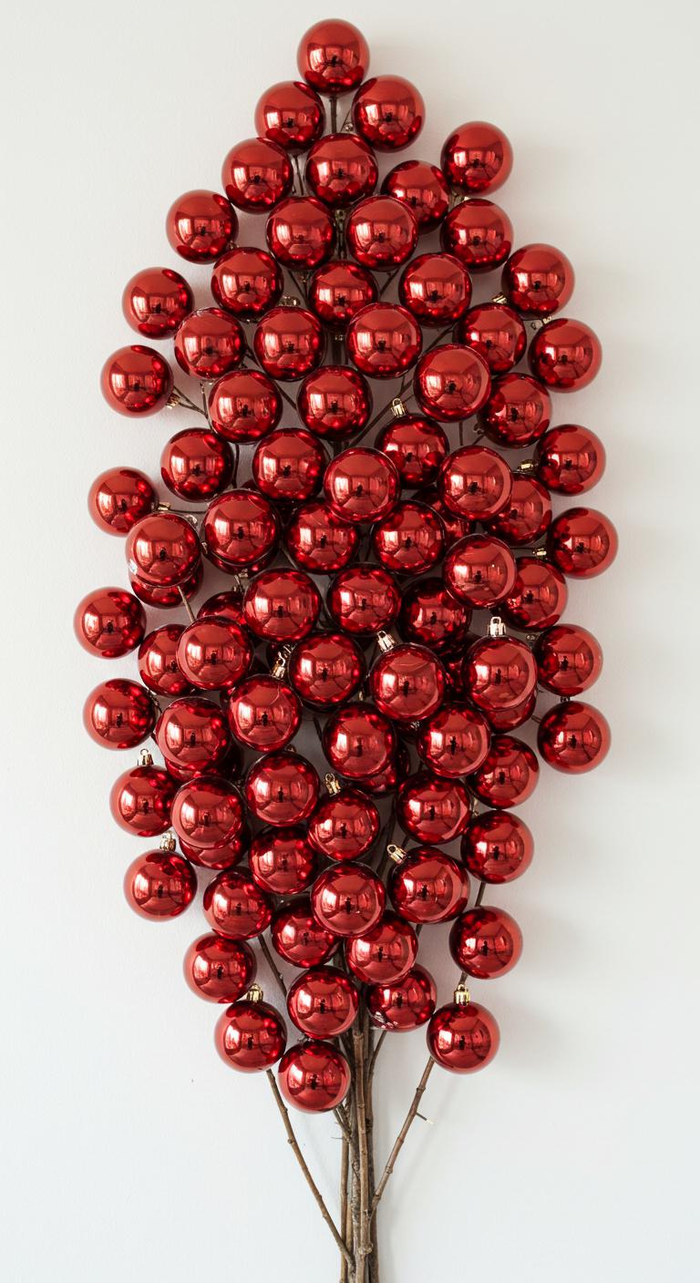 Choose a single hue and let it do the decorating: a Single-Color Ornament Cluster Tree uses groups of same-colored baubles arranged in tight clusters to form a clean, graphic tree silhouette on a wall or branch.