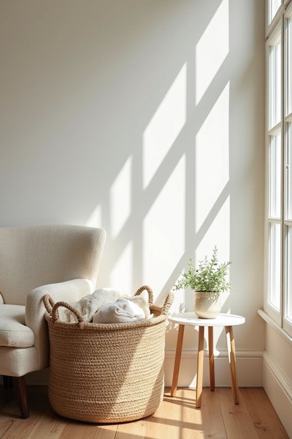 Adding woven baskets for storage brings both functionality and warmth to your space, and incorporating farm-inspired signage can further enhance your minimalist farmhouse aesthetic.
