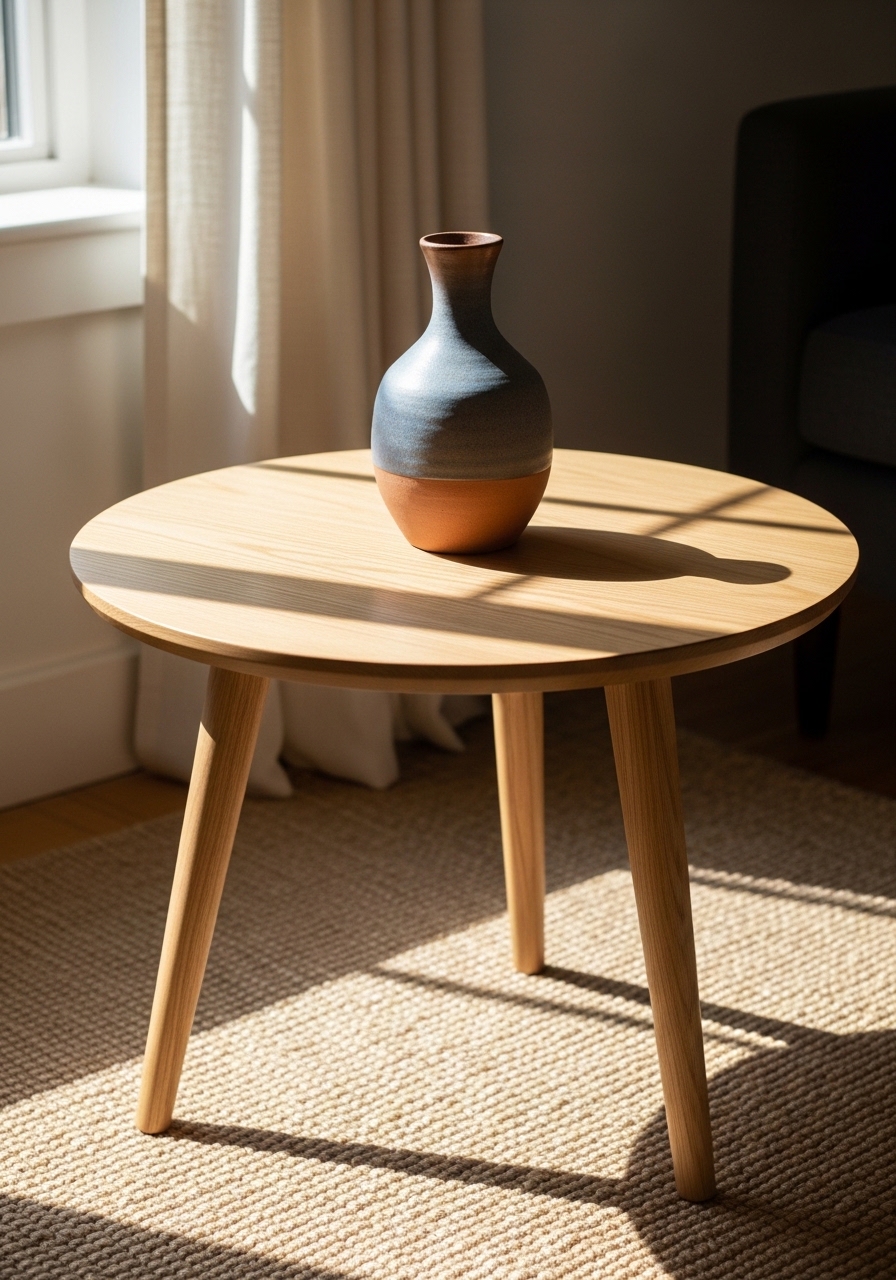 A round shape improves traffic flow in tight rooms. I chose a 36-inch oak round coffee table and kept a matte ceramic vase 8-inch. Styling tip: odd-number objects look purposeful. Mistake to avoid: picking a table too large for walking paths.