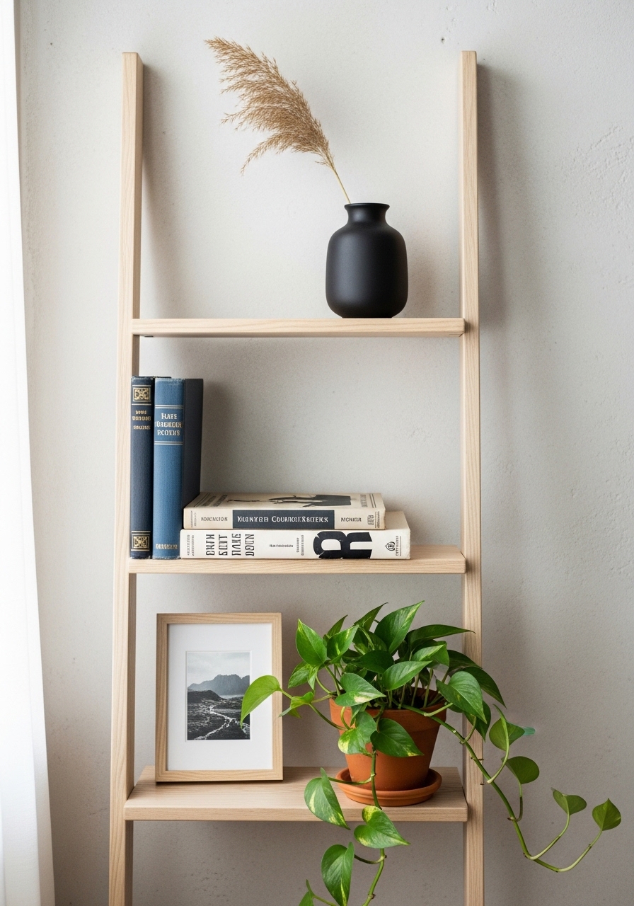 I swapped a heavy bookcase for a leaning ladder shelf 60-inch. I styled it with a 6-inch ceramic planter and two curated books. Styling tip: leave every other shelf empty. Mistake to avoid: overcrowding with identical frames.