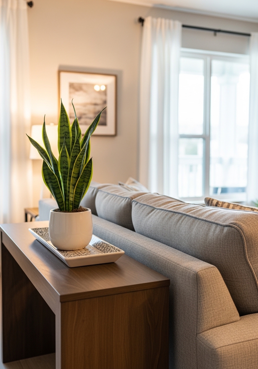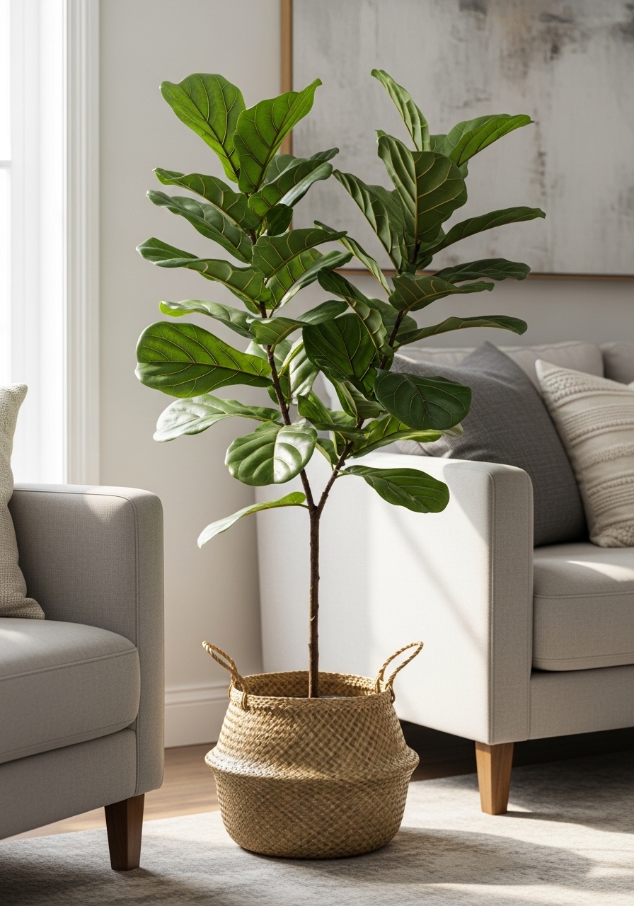 A single 6-foot fiddle leaf fig or tall snake plant brings life without clutter. I use a 12-inch woven basket planter to ground it. Styling tip: pick one statement plant, not many small ones. Mistake to avoid: using plants that require high light in dim rooms.