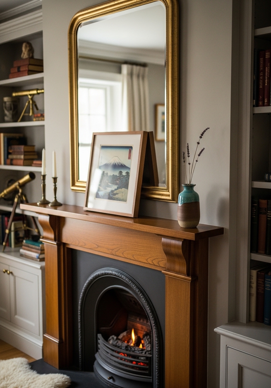 I kept the mantel simple: one framed print and a small 8-inch ceramic vase. The restraint reads intentional. Styling tip: keep mantel items under 2/3 the width. Mistake to avoid: filling it with many small knickknacks.