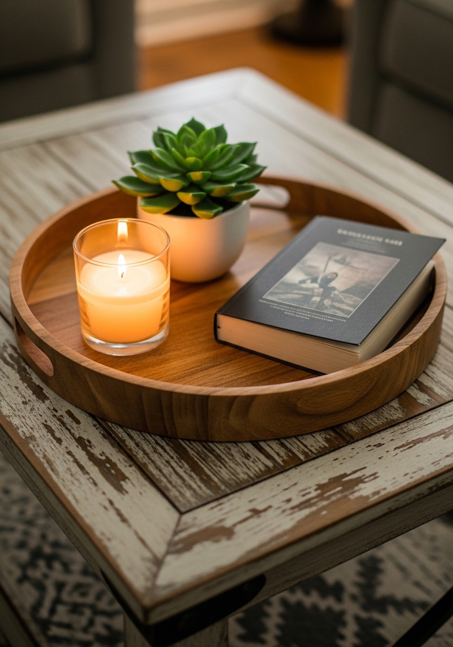 I use a 12-inch rattan tray to contain coffee table items. Inside: one candle and one small book. Styling tip: maintain odd numbers and keep negative space. Mistake to avoid: too many decorative elements that create visual noise.