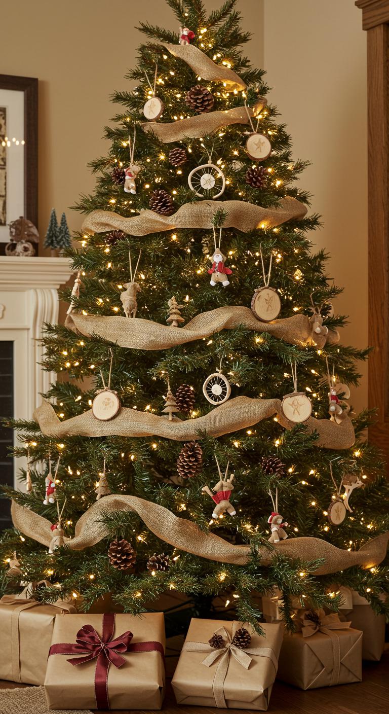 Adorn your tree with rustic ornaments, like handmade wooden figures and burlap ribbons, while incorporating natural textures like pinecones and twigs.