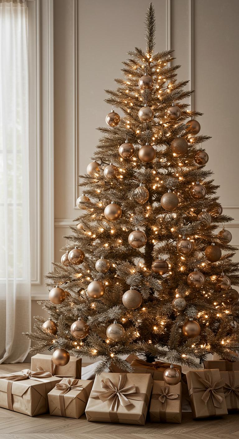 Imagine a Christmas tree that embodies warmth and elegance with a warm taupe color palette, beautifully enhanced by subtle sparkles.