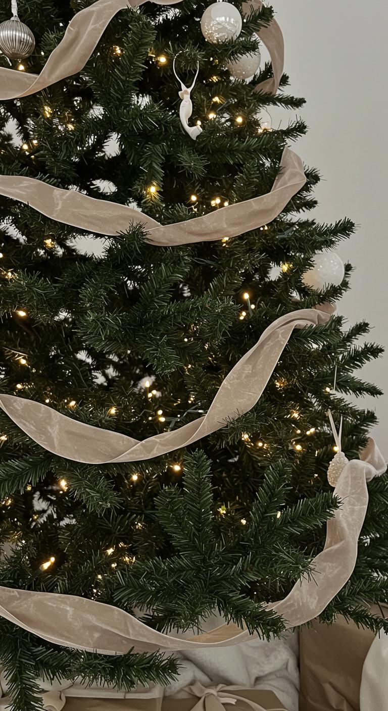 Neutral-toned velvet ribbons add a touch of sophistication to your minimalist Christmas tree, wrapping it in understated elegance.