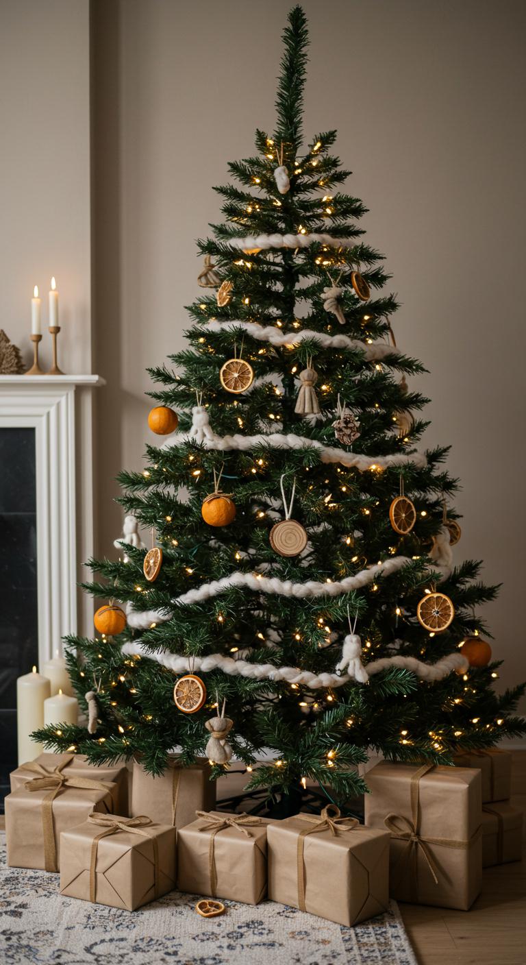 Adorn your tree with wooden ornaments, dried citrus slices, and soft wool accents.