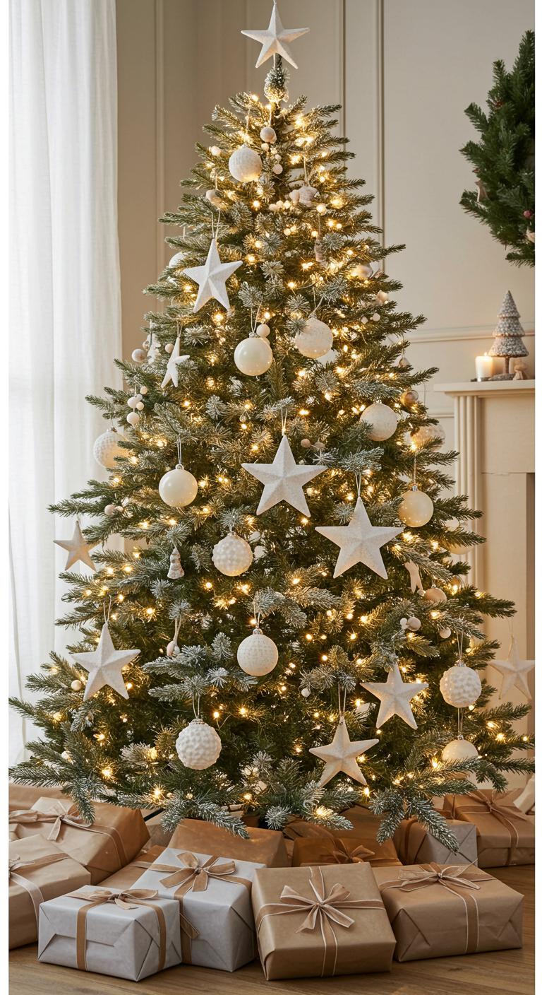 Adorn your tree with delicate ivory ornaments that shimmer softly under the lights, while charming wooden stars add a rustic touch.