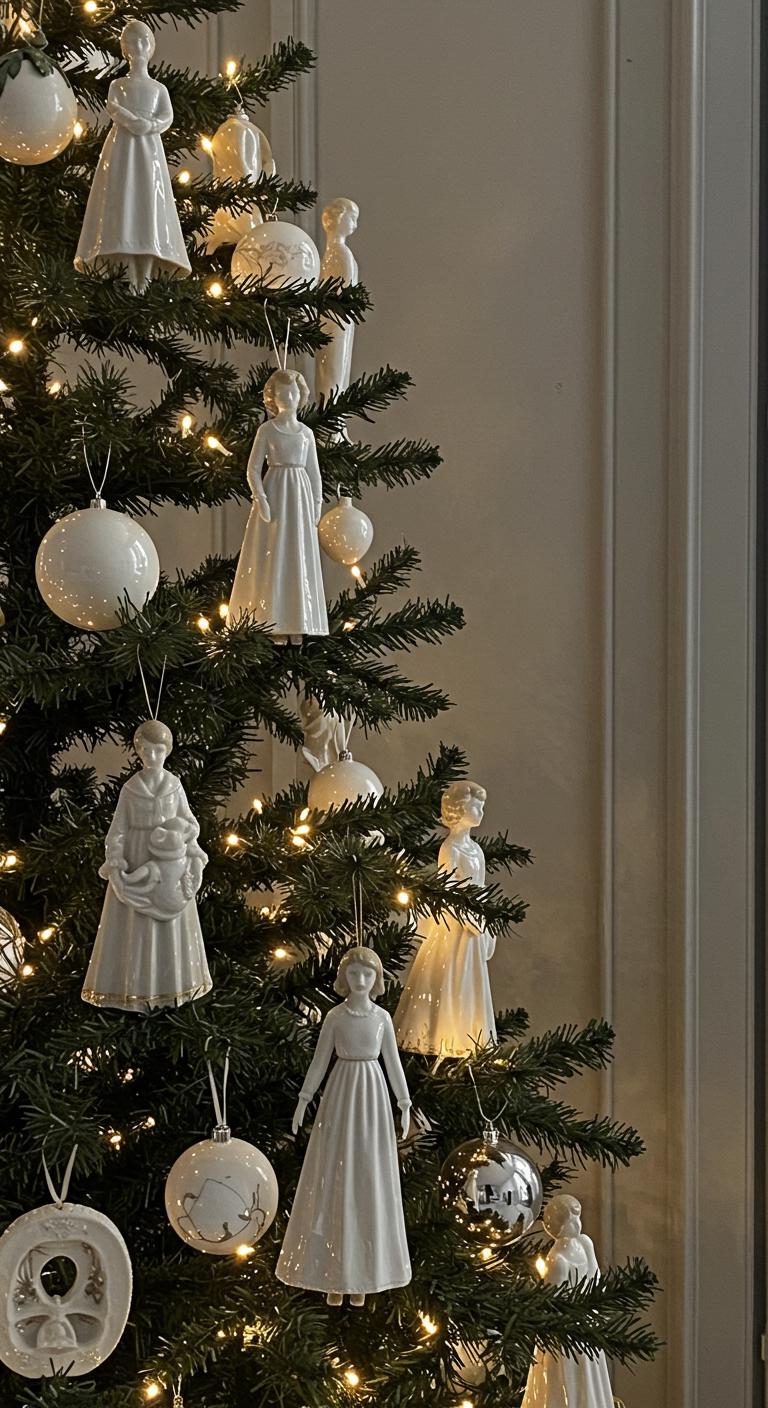 Delicate porcelain figurines add an enchanting charm to your minimalist Christmas tree, elevating its elegance with a touch of artistry.