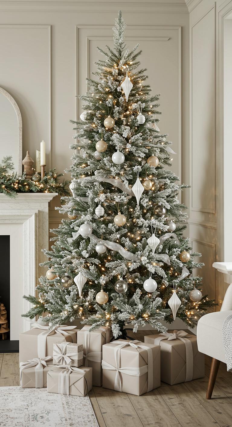 Adorn your tree with delicate frosted accents and a blend of soft neutral textures, creating a harmonious visual feast.