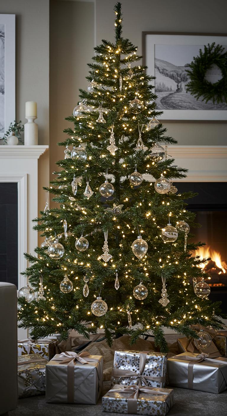 Clear glass and crystal ornaments add a touch of sophistication to your minimalist Christmas tree design.