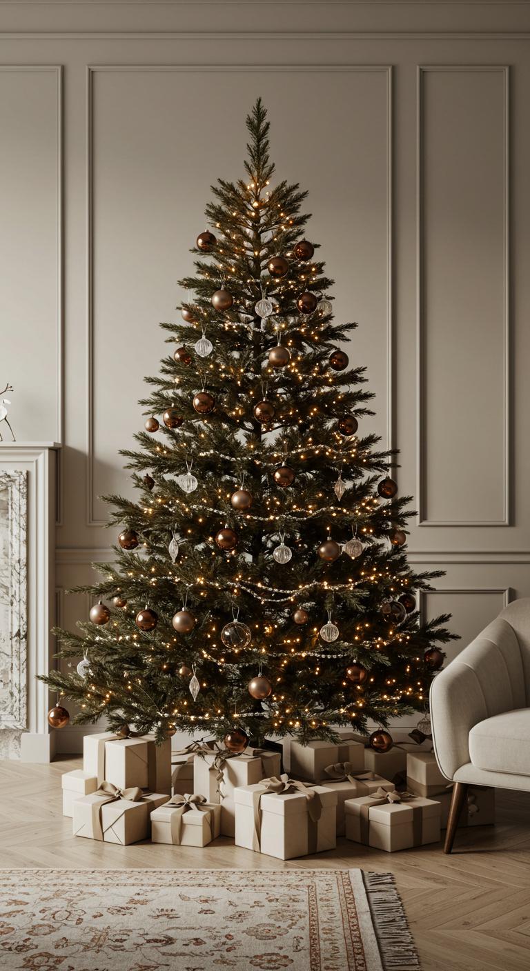 After embracing the elegance of clear glass and crystal, consider the warm, earthy tones of a simple brown and tan palette for your minimalist Christmas tree design.
