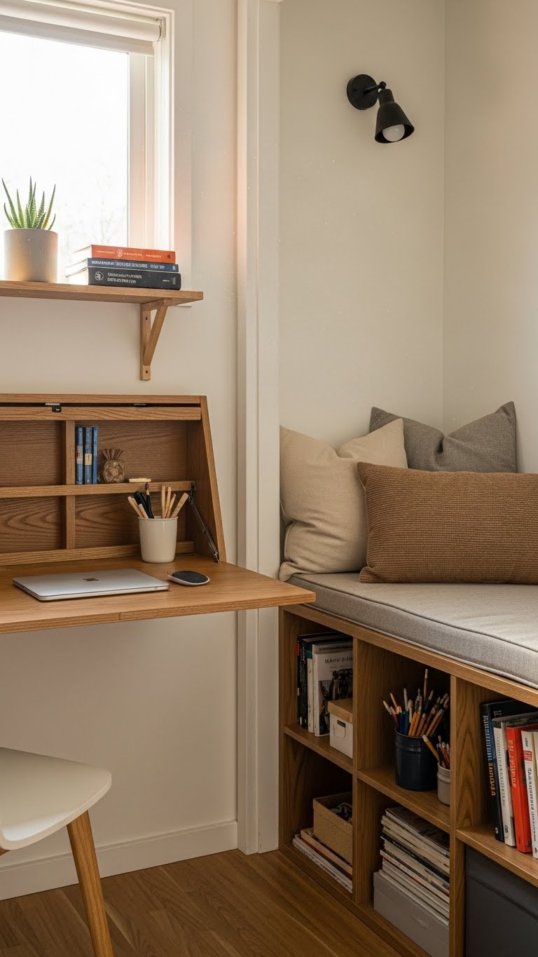 Turn one area into a desk and lounge spot. This works great in small apartments. Use affordable folding furniture from budget stores. Set up with items you already own. DIY tip: Add wheels to a side table for easy move. Keep it clutter-free with hidden storage. For instance, use baskets under benches. Focus on what you use most. Make adjustments as needed for flow.