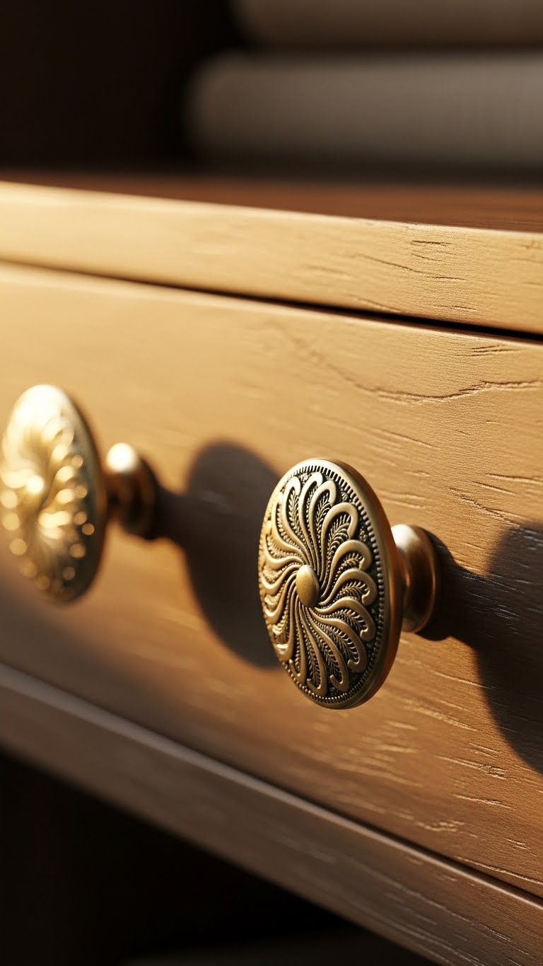 Switch knobs to etched brass for a fresh touch. It upgrades simply. Buy a set for under $20. Unscrew old ones yourself. DIY clean: Polish with household items. Place on cabinets for effect. Keep it subtle to match your style.