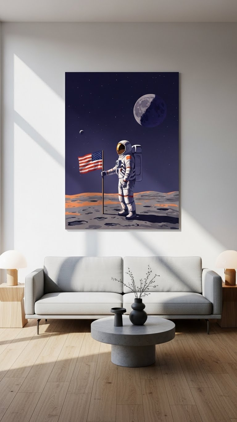 Pick a big print to stand out against simple backgrounds. It adds personality fast. Find affordable art prints online. Hang it with basic tools you have. DIY frame using cardboard from home. Place it at eye level for impact. Budget idea: Print from your photos. Keep the rest of the wall bare. This highlights the piece without fuss.