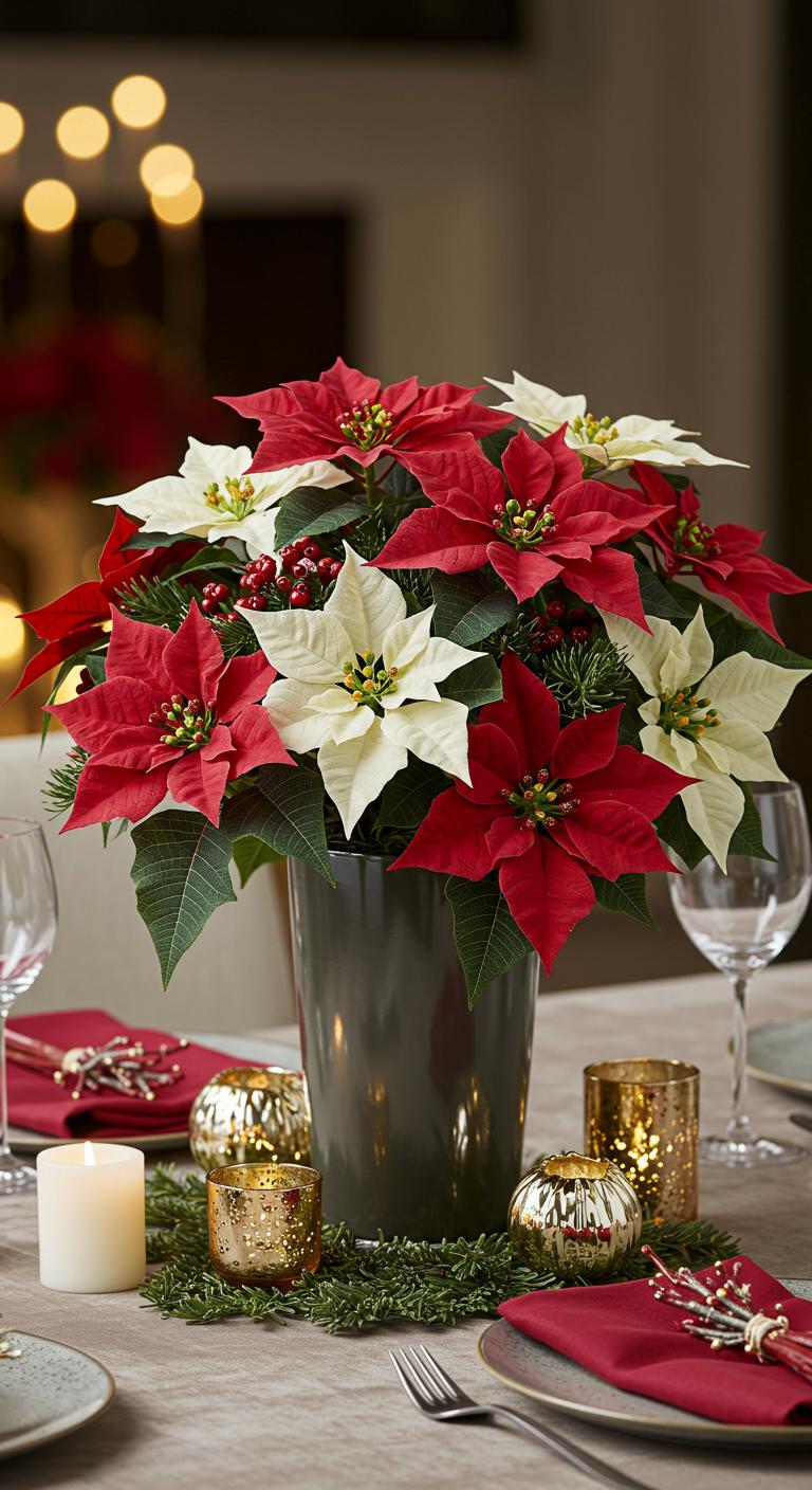 A classic red-and-white poinsettia centerpiece brings instant holiday polish to your table, pairing vibrant crimson bracts with crisp ivory accents for a look that’s both timeless and on-trend.