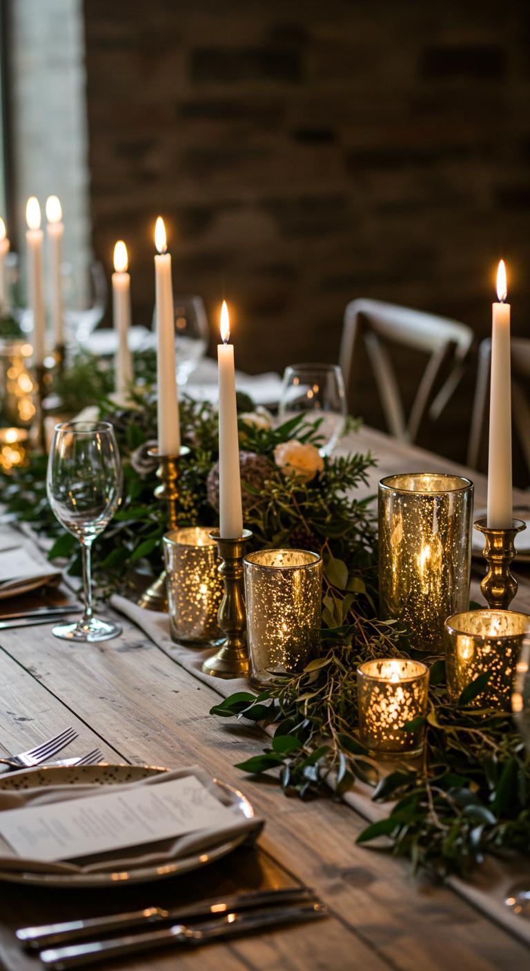 After the long runner sets the scene down the center of your table, bring the glow up with a candlelit mercury glass floral cluster that casts a warm, vintage-modern shimmer.