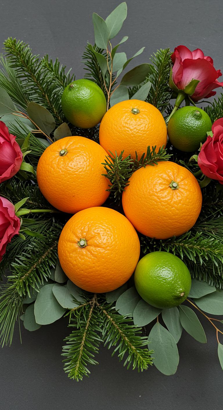 Bring three or five bright citrus fruits into your centerpiece to punctuate winter greens with sunny color and fresh scent, and let their glossy skins play off soft blooms for a modern, festive twist.