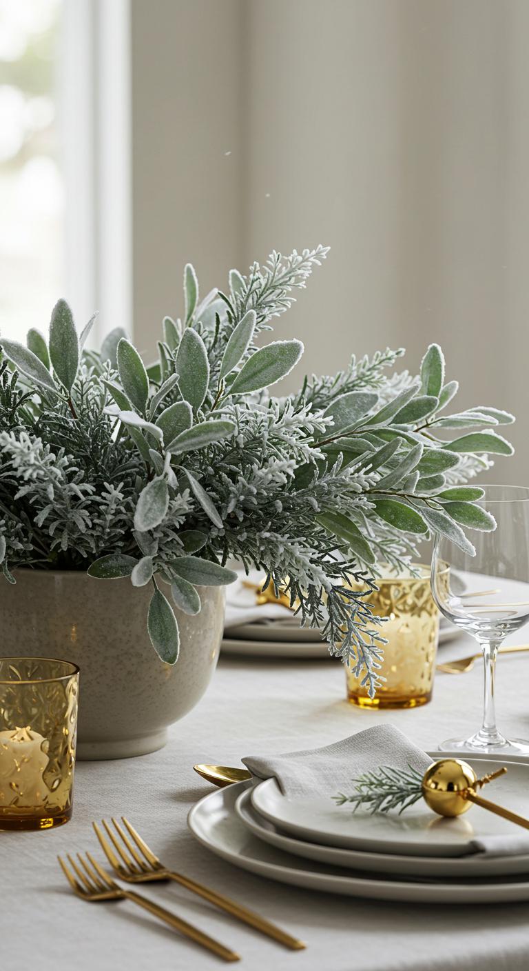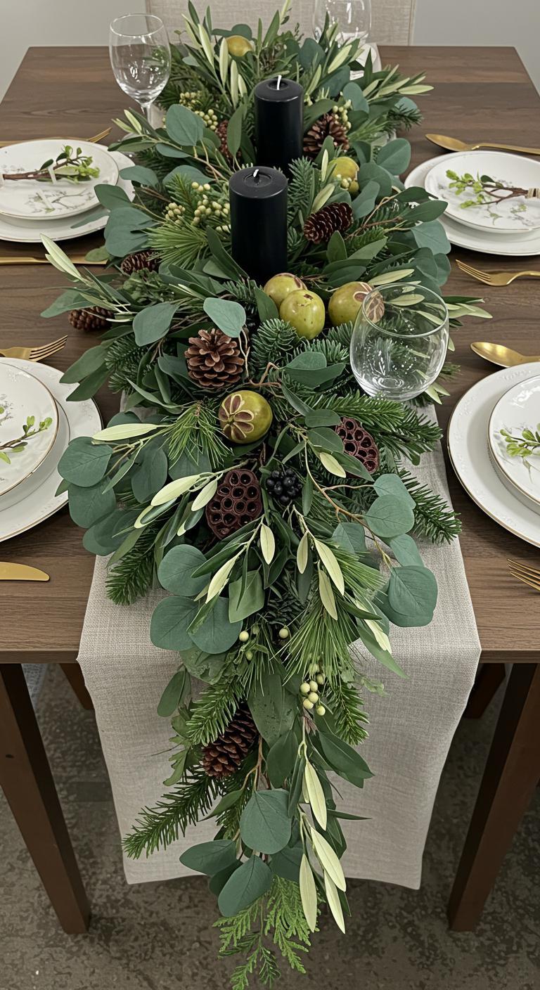 You’ll weave eucalyptus, fir, and olive sprigs into a relaxed, continuous arrangement, leaving negative space for plates and glassware.