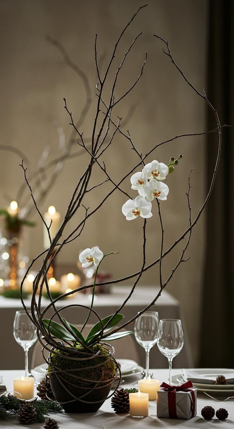 Think of a striking asymmetrical branch-and-orchid arrangement as sculpture for your holiday table: you’ll balance the airy sweep of bare, curving branches against the refined silence of a few orchid blooms, creating movement that draws the eye without crowding the setting.