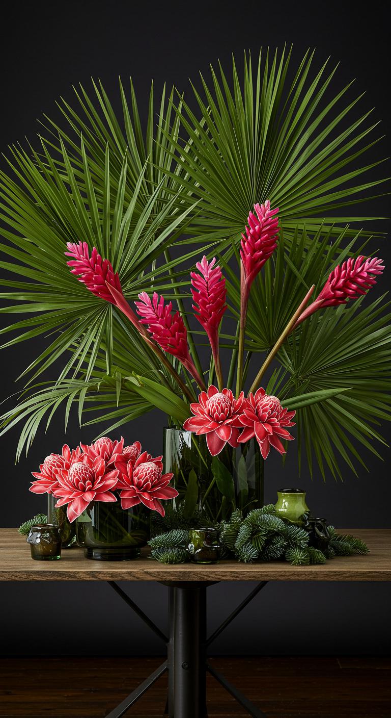 Though unexpected among evergreen wreaths, a tropical twist with red ginger and palm instantly lifts your holiday scheme, bringing bold color and structural drama to seasonal tables and entryways.