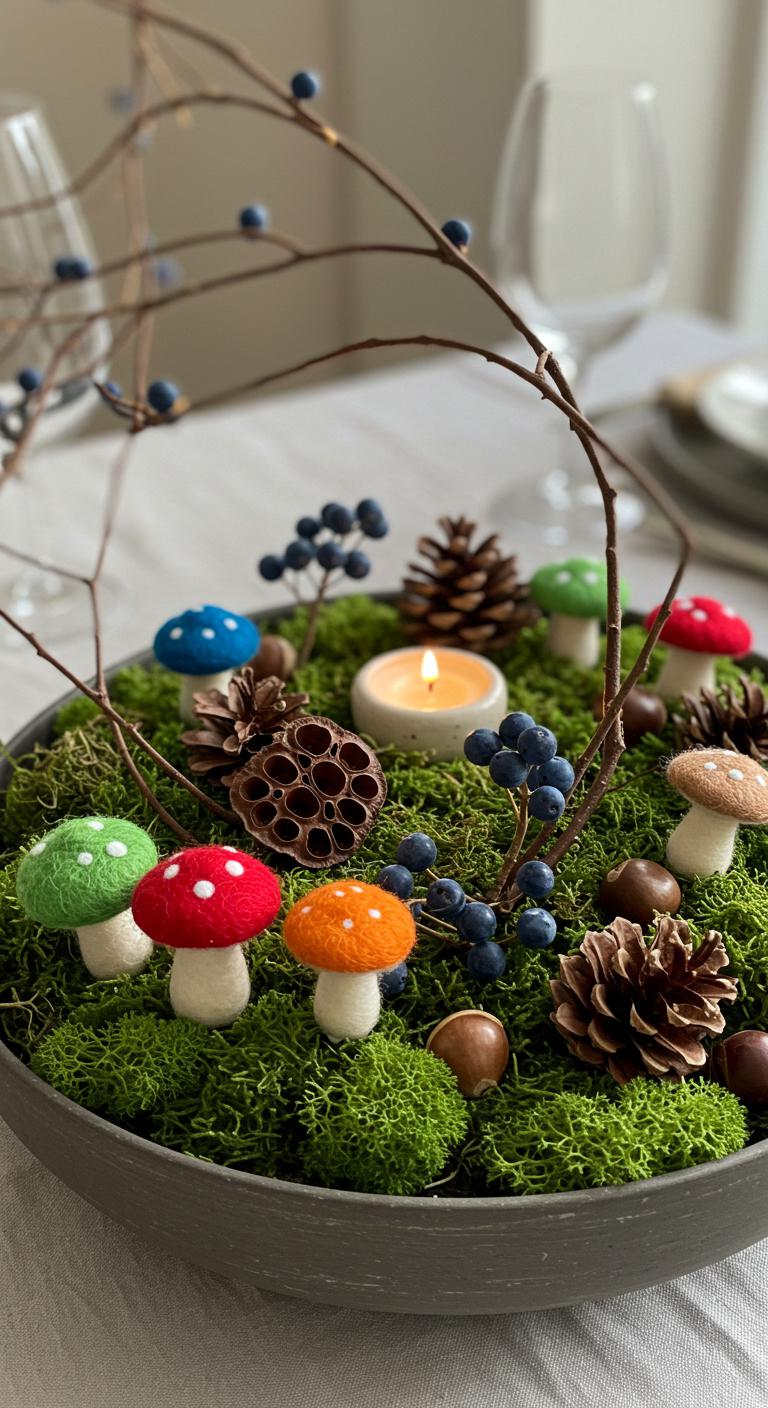 Because you want a centerpiece that feels like a pocket of forest on your table, build a low bowl layered with plush sheet moss, tiny toadstool accents, and a scattering of pinecones and seed pods.