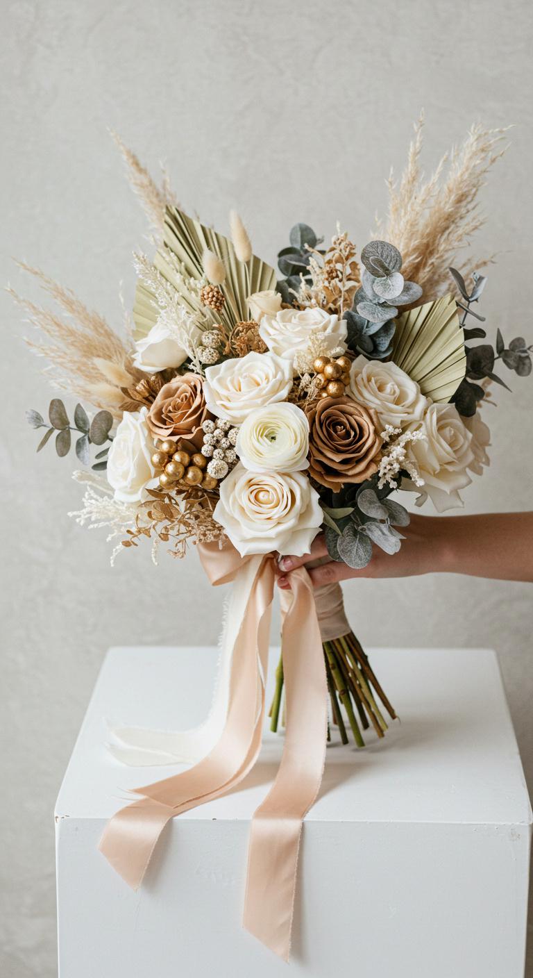 When you want a bouquet that feels timeless yet quietly modern, choose a palette of champagne, soft gold, and ivory to let texture do the talking; silk ribbons, frosted berries, and dried pampas add movement while pale roses, ranunculus, and bleached eucalyptus keep the look airy and bridal.