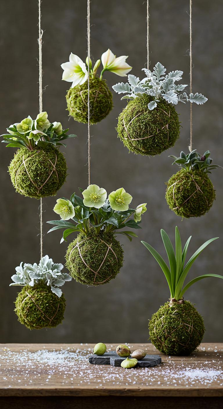 Though rooted in Japanese tradition, hanging kokedama gets a fresh winter wardrobe when you swap summer ferns for frosted hellebores, miniature amaryllis, and silvered eucalyptus; you’ll suspend these moss-wrapped orbs at varying heights to create a rhythmic, snowy canopy that’s both sculptural and unexpectedly cozy.