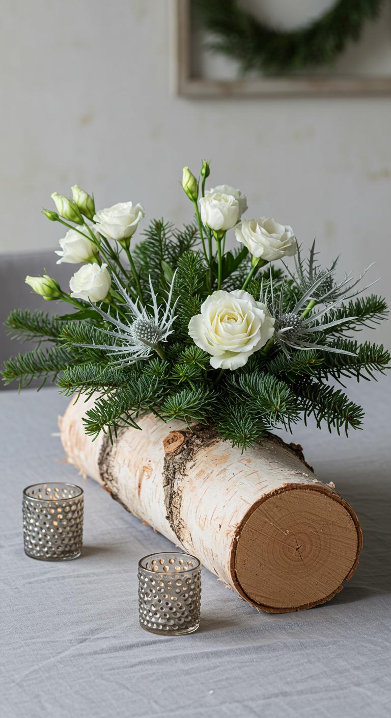 Though rooted in cozy Nordic calm, this Scandinavian-inspired birch log arrangement brings crisp modernity to your holiday table: you’ll use a hollowed birch log design as vessel, filling it with airy white blooms, sprigs of pine, and spiky silver foliage.