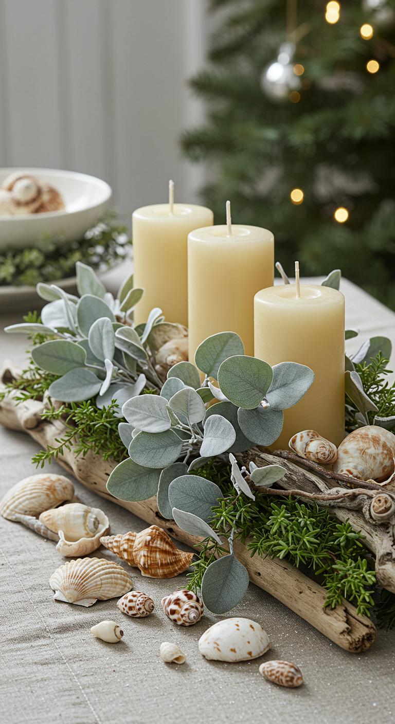 Think sand and salt air as you build a centerpiece that pairs silvery eucalyptus with weathered shells—this coastal holiday look feels fresh, modern, and unexpectedly festive.