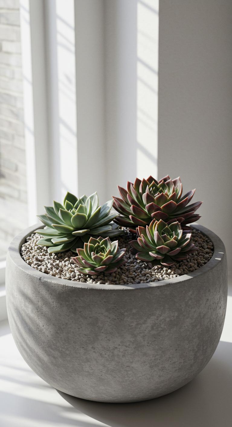 After the airy coastal centerpiece, bring the same clean, modern mood indoors with a minimal concrete planter filled with winter-hardy succulents. You’ll craft a spare vignette—papery rosettes, tactile gravel, and sculptural stems—that celebrates restraint and movement. Focus on succulent care: crisp drainage, modest watering, and cool light. Embrace winter planting as a quiet act of liberated style.