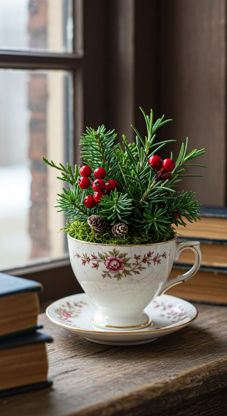 One delicate teacup can transform a corner into a memory: tuck a miniature Christmas posy into a chipped porcelain cup and you’ve got instant charm that’s both vintage and utterly now.