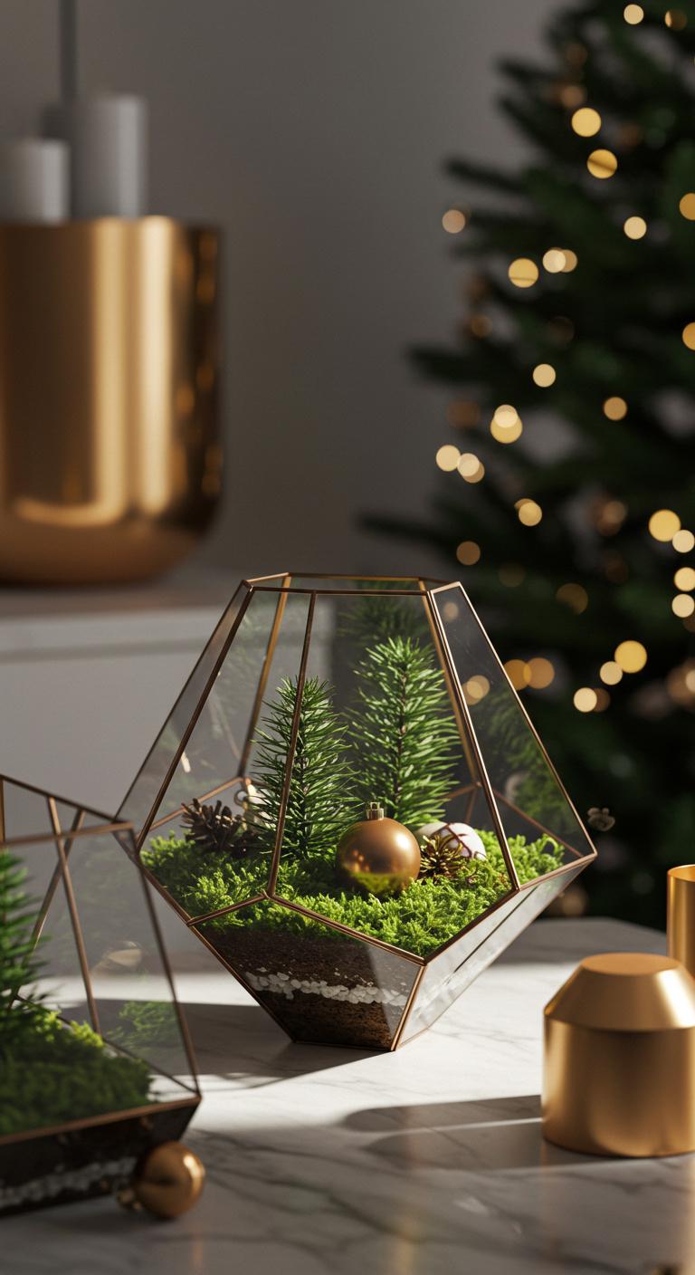 If the teacup felt intimate and nostalgic, a modern geometric terrarium shifts the vibe to bright, architectural chic—perfect when you want a holiday piece that reads contemporary but still cozy.