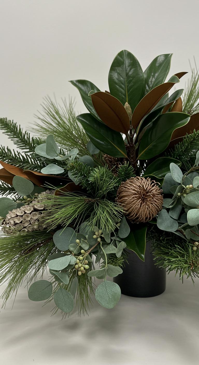 Texture takes center stage in a high-style mixed foliage arrangement, where glossy magnolia leaves, feathery eucalyptus, sculptural fir branches, and unexpected accents like dried lunaria play off one another to create depth and movement.