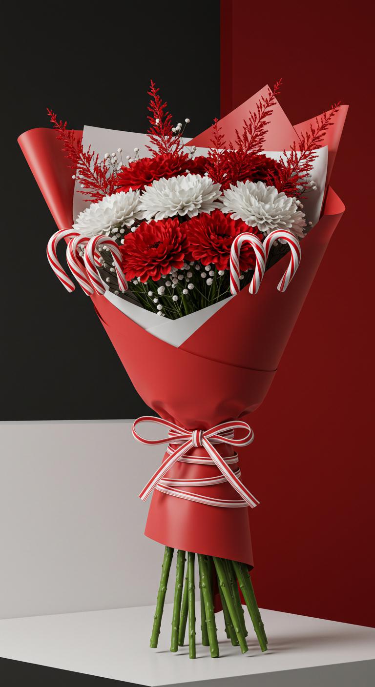 You’ll pick bold red and white blooms, tie stems in alternating bands for candy cane inspiration, and finish with minimalist festive wrapping.