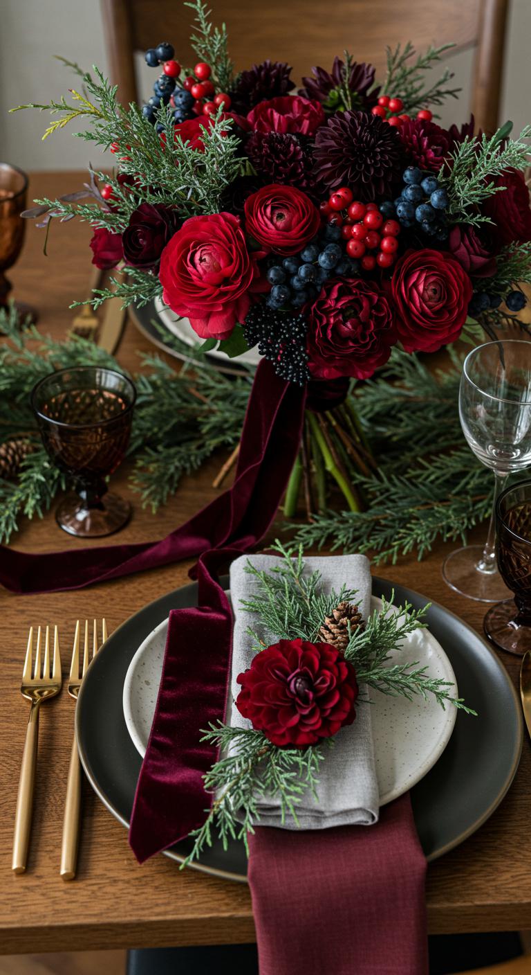 Shifting from the cool minimalism of birch and white blooms, the Velvet Ribbon and Deep Berry Bouquet brings warmth and tactile drama to your holiday table.