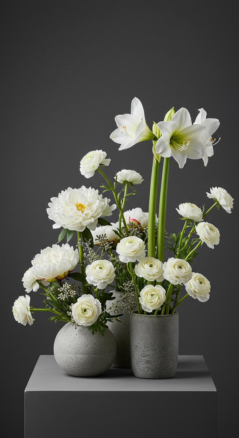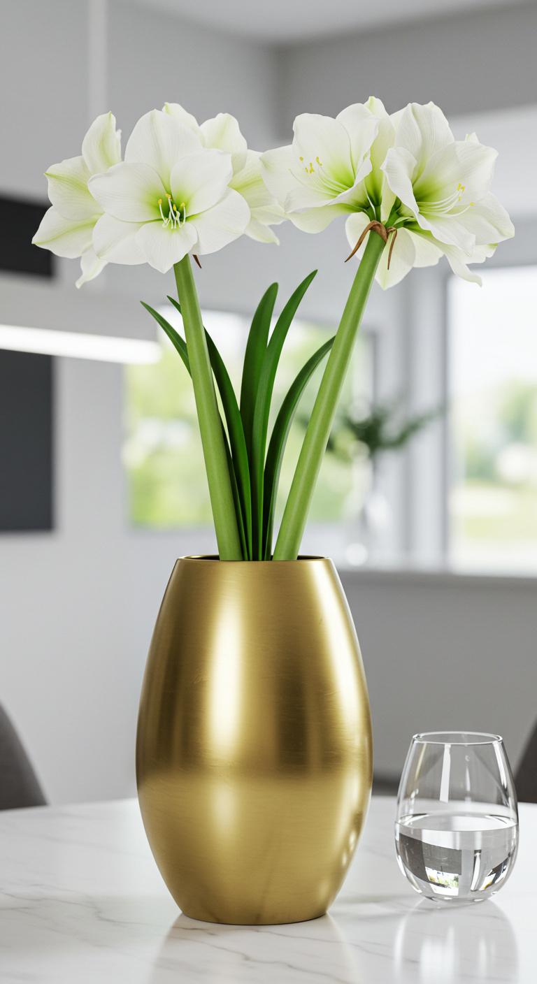 If you want a centerpiece that feels crisp and current, pair sculptural white amaryllis with a sleek metallic vase—its brushed brass or matte chrome finish will mirror the blooms’ bold silhouette and sharpen your table’s modern edge.