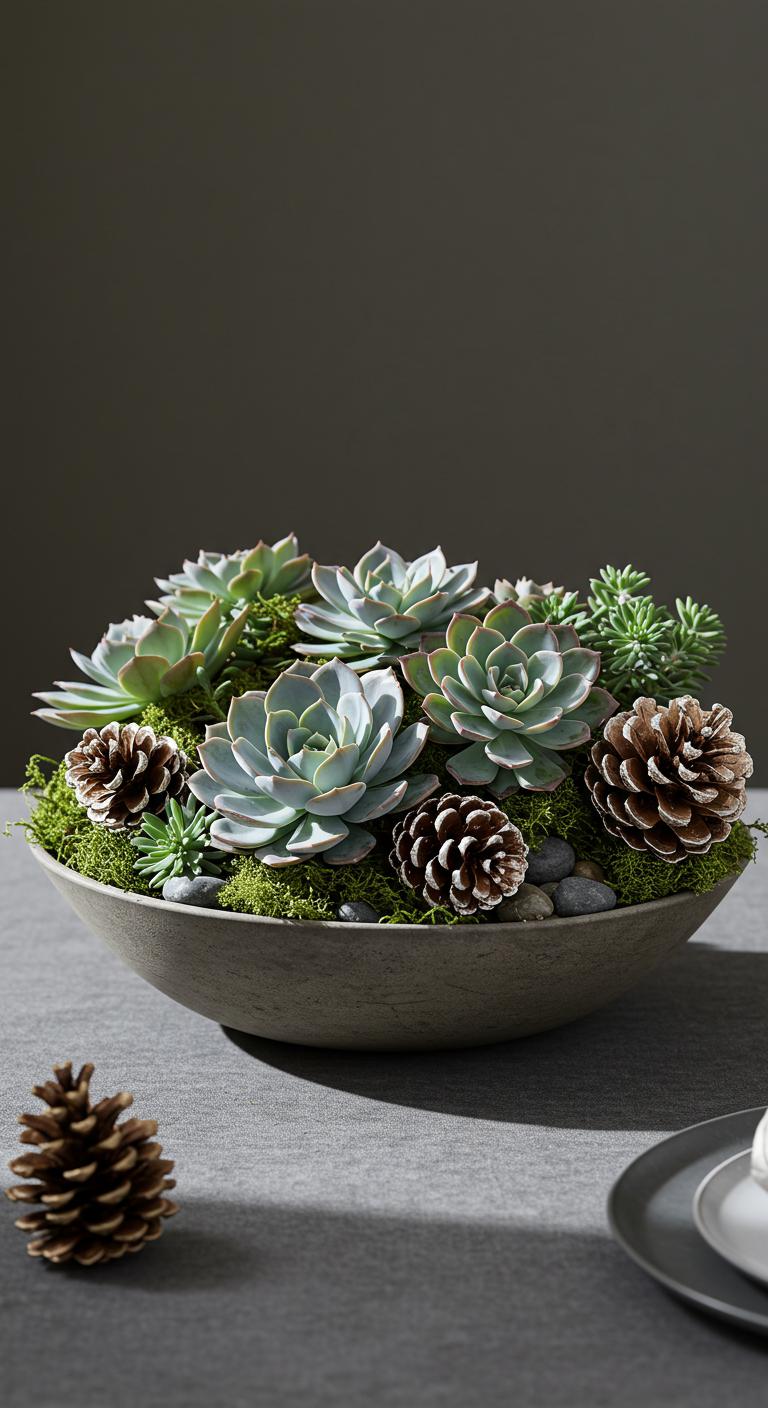 A low, sculptural bowl of mixed succulents and pinecones gives your holiday table a contemporary, textural twist—think dusty rosettes, glossy sedums, and frosted fir cones nestled amid moss and river stones.
