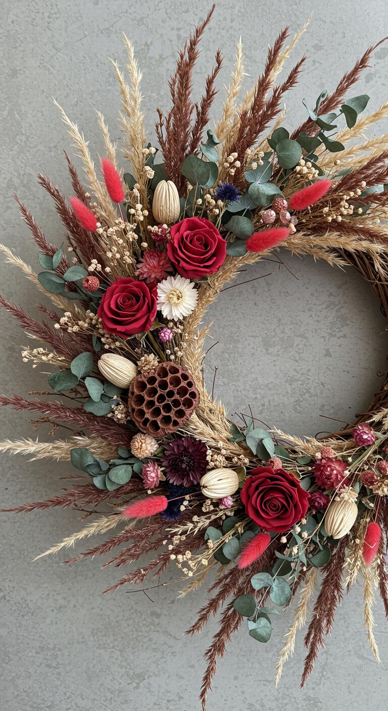 When you want a wreath that feels timeless yet on-trend, combine feathery dried grasses with preserved roses to create a tactile, low-maintenance centerpiece that still reads luxurious; the grasses bring movement and neutral warmth while the preserved blooms offer deep, lasting color and romantic form.