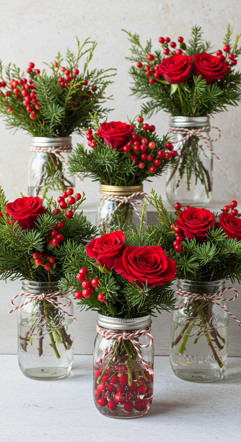 If you’re tight on space but still want holiday charm, compact mason jar posies pack big seasonal style into a small, budget-friendly vessel.