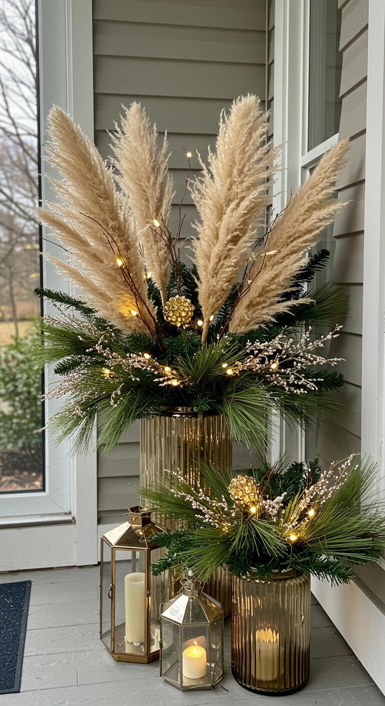 When you bring pampas grass into your holiday porch scheme, its feathery plumes add sculptural height and soft texture that pairs surprisingly well with classic evergreen and metallic accents.