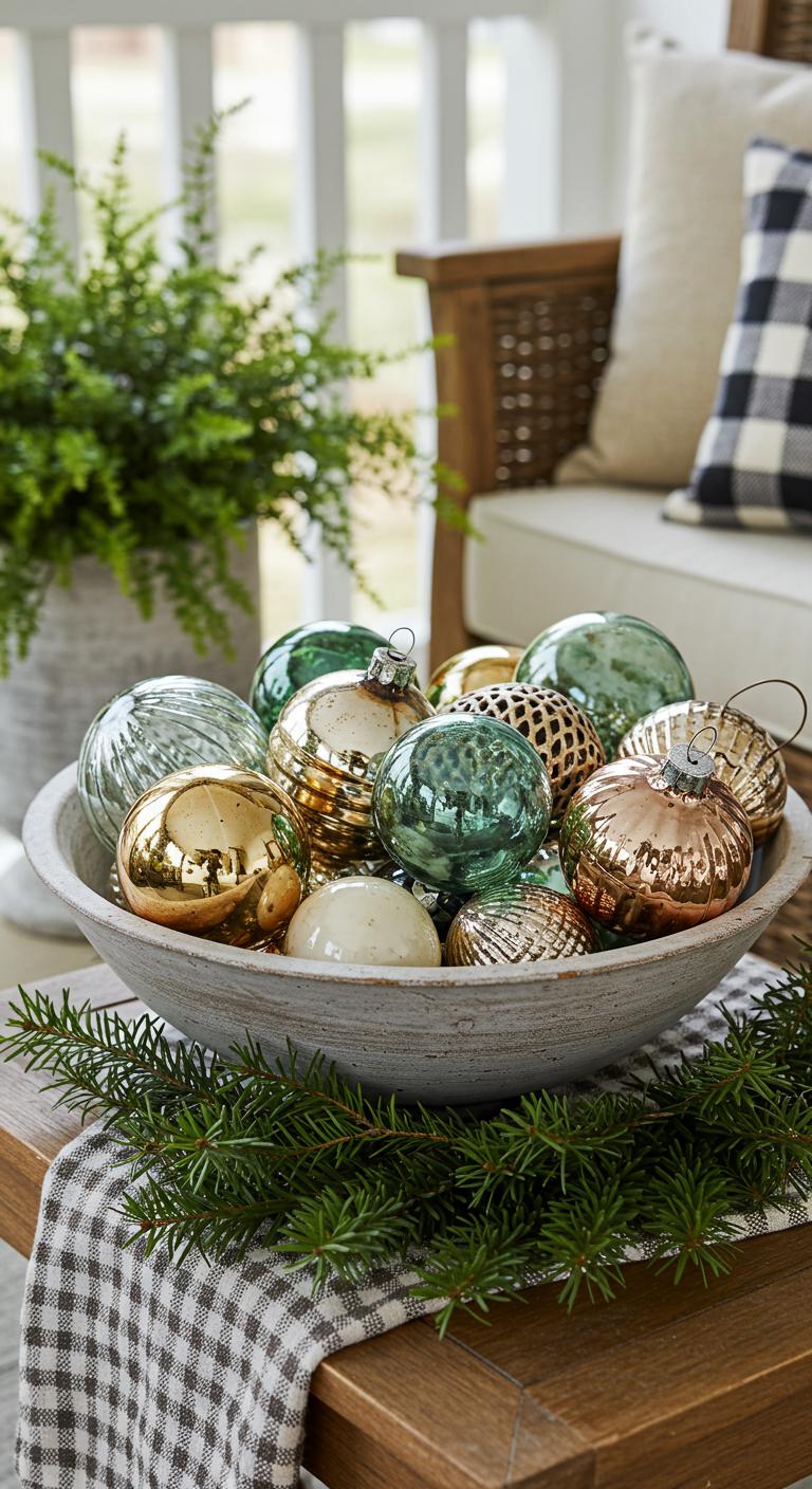 A bowlful of mixed-material ornaments instantly elevates your porch vignette by combining texture, color, and scale in one contained statement.