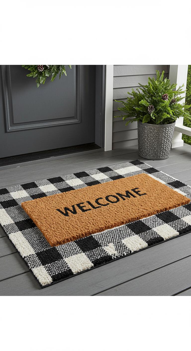 Black-and-white welcome mats make a crisp, modern statement that anchors your porch without overwhelming it.