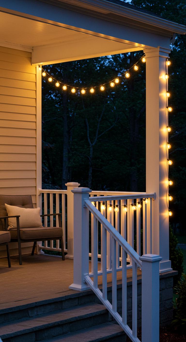 When you drape vertical string light panels down pillars or along railings, they turn ordinary porch architecture into a luminous focal point that reads modern and inviting.