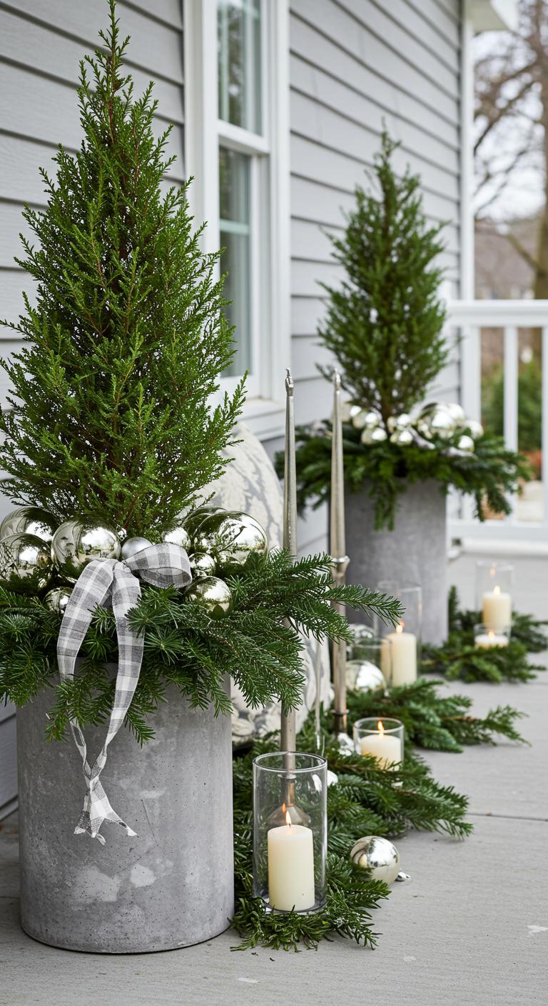 Concrete planters bring a modern, textural backbone to holiday porch groupings, and you can use them to anchor layered greenery, metallic accents, and candlelight for a chic winter display.